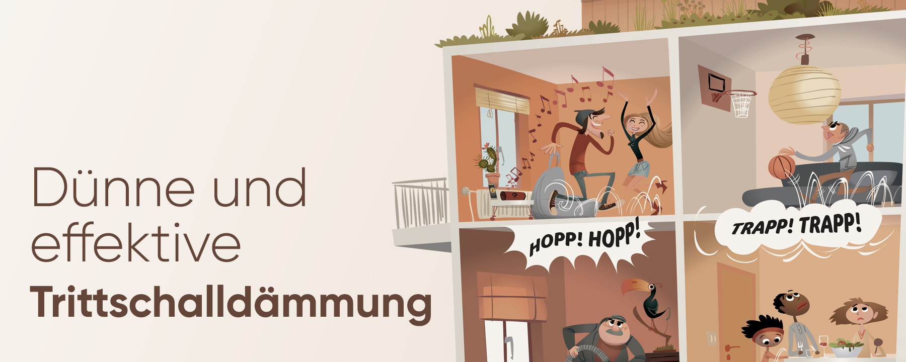 Trittschalldämmung höchster Effizienz, unter Estrich, Dicke 9 mm, Rolle 45 m², ΔLw 30-35 dB.