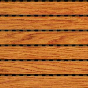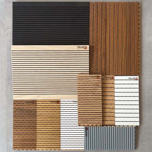 Akustikplatten aus Holz mit linearen Nuten in vielen optisch und akustisch unterschiedlichen Varianten, die unterschiedliche optische und akustische Wirkungen erzielen.