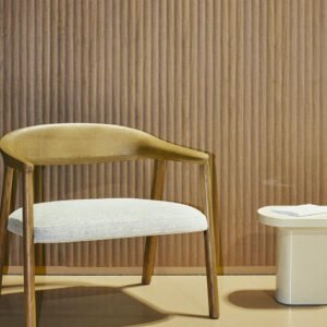 Akustikplatte aus Holzfurnier und recycelten Fasern für ein warmes, natürliches Erscheinungsbild des Innenraums.